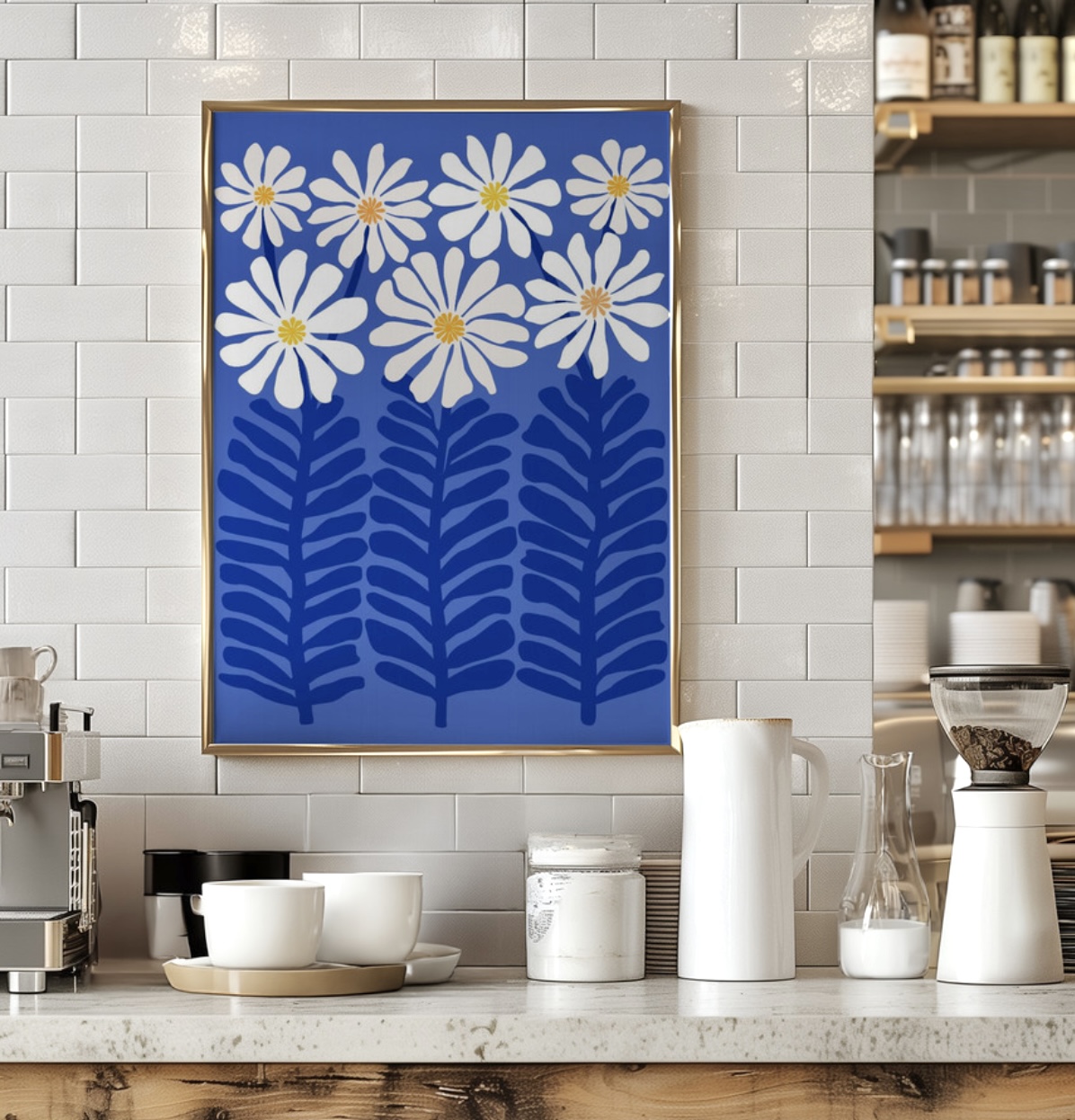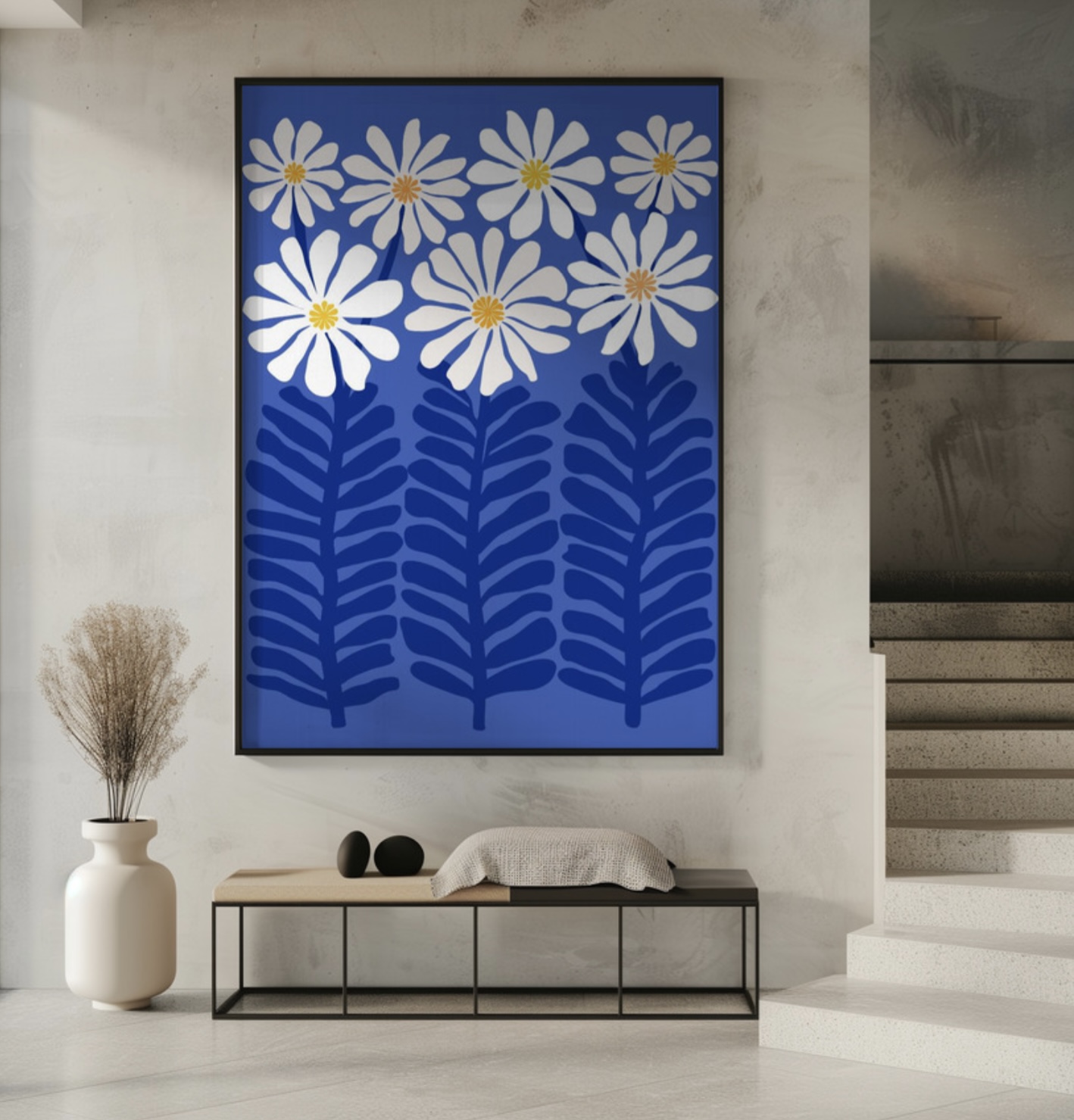 Description: Set against a deep cobalt blue background, bright white flower shapes pop out atop dark blue stems. This bold floral artwork by Kristian Gallagher is available as home decor, art prints, and other wall art.